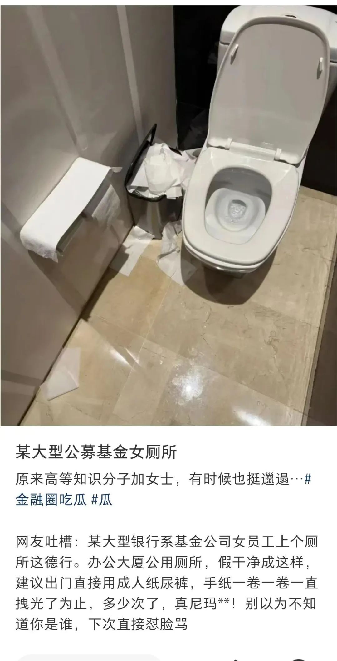 最近,某大型公募基金公司的女厕所成为了众人关注的焦点。一位网友在社交平台上晒出了一张令人震惊的照片:厕所里一片狼藉,卫生纸散落一地,仿佛刚刚经历了一场“卫生纸风暴”。这位网友在帖子中写道:“原来高等知识分子加女士,有时候也挺邋遢…”